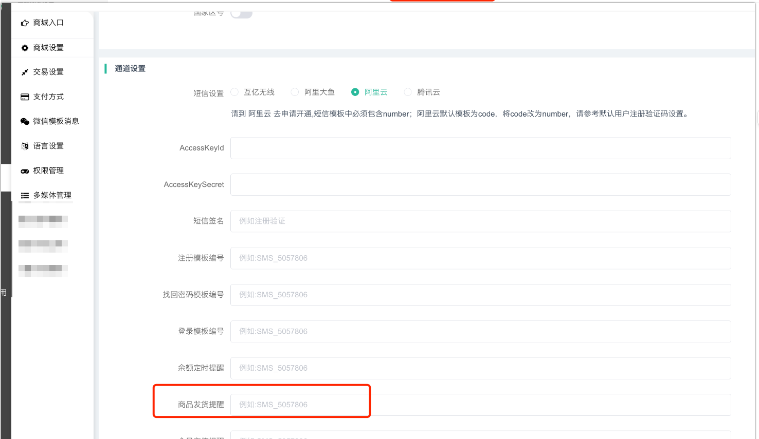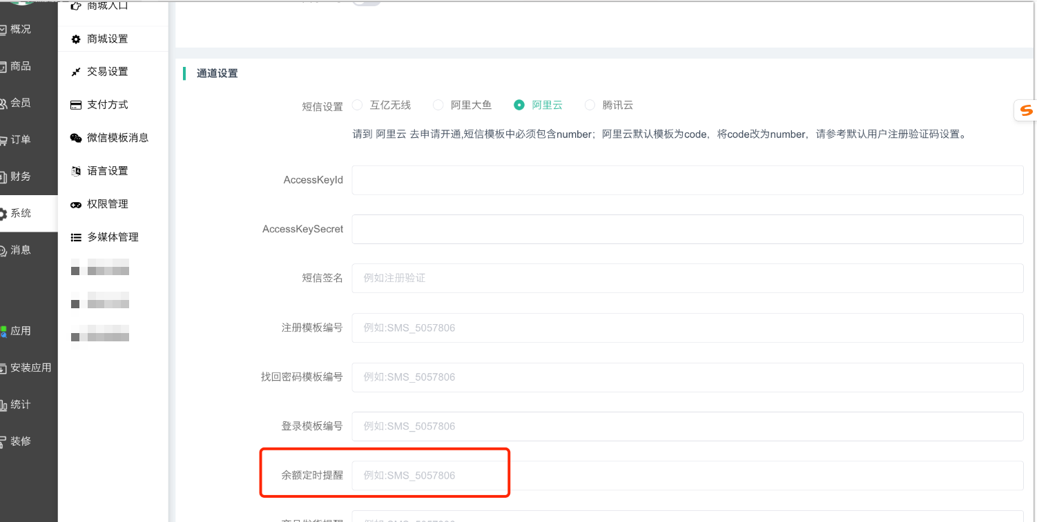 1)商城设置—短信设置—选择阿里云短信,填写好余额定时提醒模板