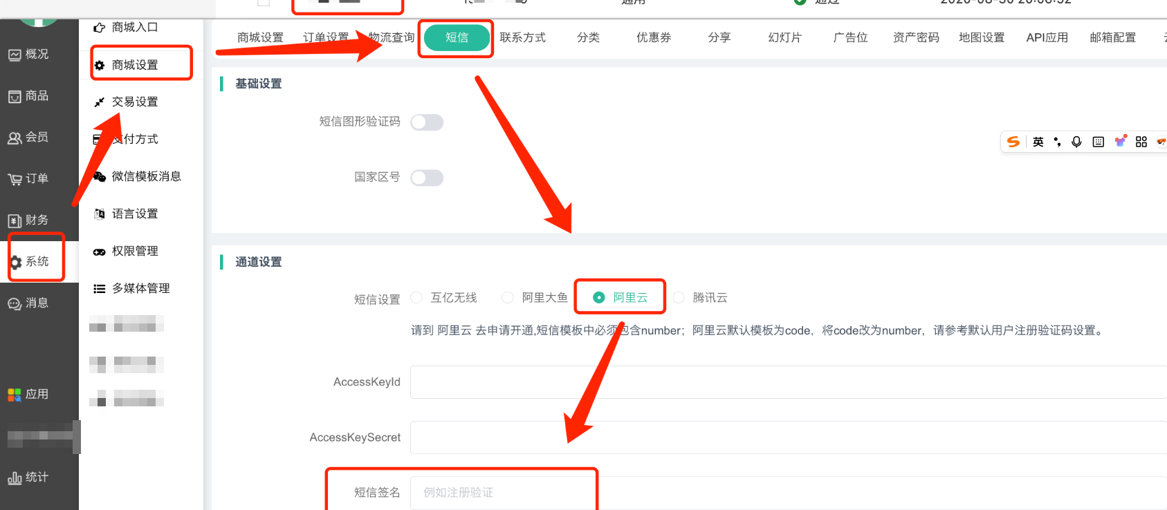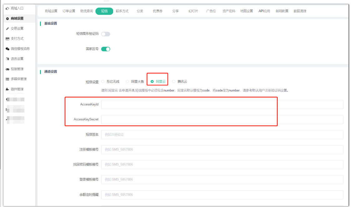 7、将获取到的AccessKey和AccessKeySecret参数信息对应填写到商城后台系统--商城设置--短信“阿里云”下即可。